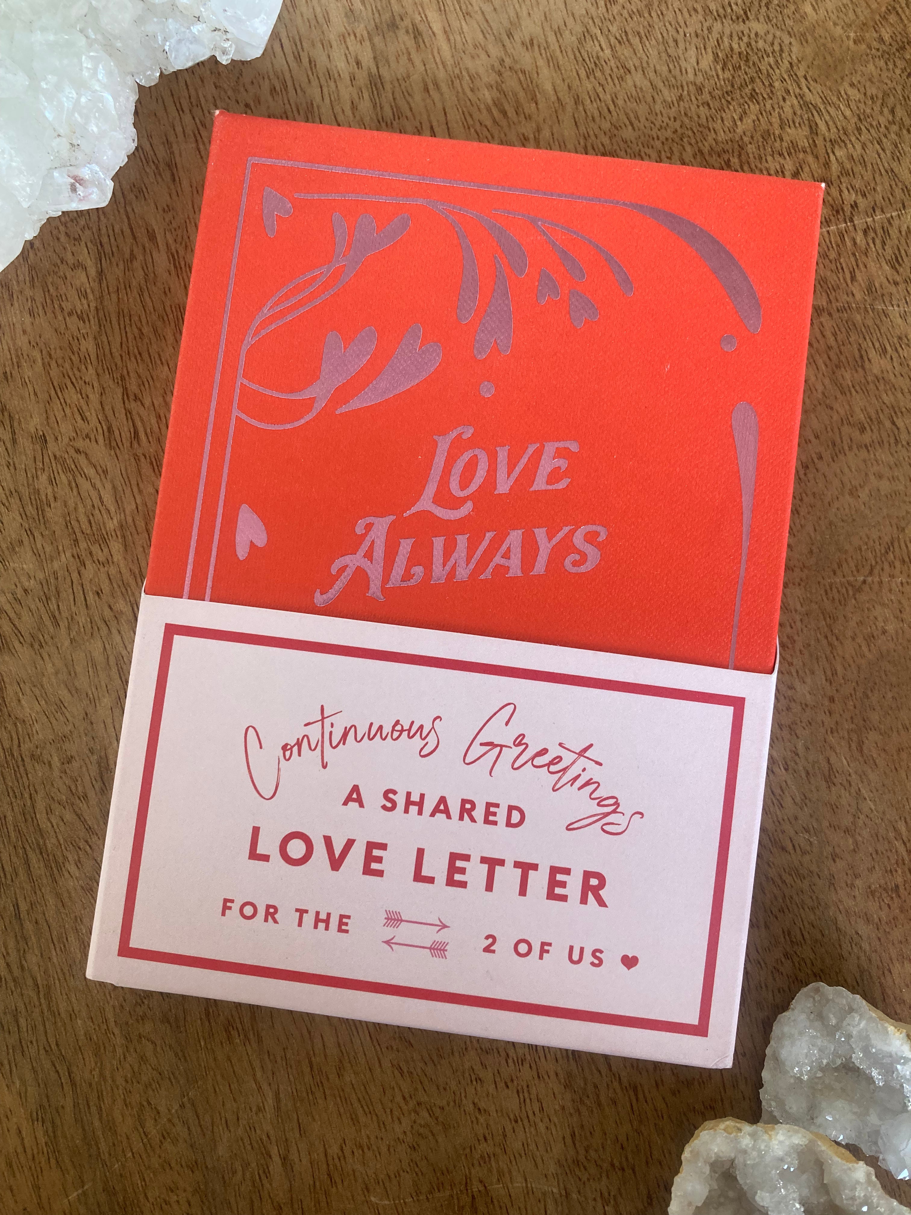 A unique memory-keeping card for couples that is a romantic gift that keeps on giving.Designed to be exchanged again and again, this continuous card is like dozens of greeting cards in one. Inside the sweet hardcover portfolio are two accordion-folded cards to fill out with messages over time. To begin, just write in the date and a message to your love for any romantic occasion: Valentine's Day, holidays, anniversaries, or just because. Then it's their turn to write back at a special moment of their choosing! As you each fill the card, you'll be able to see all your messages in one place, creating one shared story of your relationship that grows with you—and a keepsake that you'll cherish forever.A PRICELESS TIME CAPSULE: As a collection of messages exchanged between you and your love, this card becomes a time capsule of your relationship. You'll both be able to look back on your handwritten notes commemorating anniversaries, holidays, and all you've shared over the years—in one place. It's like a shoebox full of love notes but collected in one sweet, organized archive. A UNIQUE ROMANTIC GIFT: Presented in a beautifully designed hardcover portfolio, this memory-keeper is an extra-special gift like no other for Valentine's Day, holidays, or any special occasion. No additional present required! REDUCE AND REUSE: This product was created with sustainability at its heart. Instead of purchasing disposable cards every year, give the one card that's a keepsake no one will ever want to toss.Perfect for: Partners or spouses looking for romantic, sentimental gifts Couples separated by long distances Valentine's gift for him or for her Engagement, wedding, or anniversary gift for couples Fans of Letters to My Love or the One Line a Day series