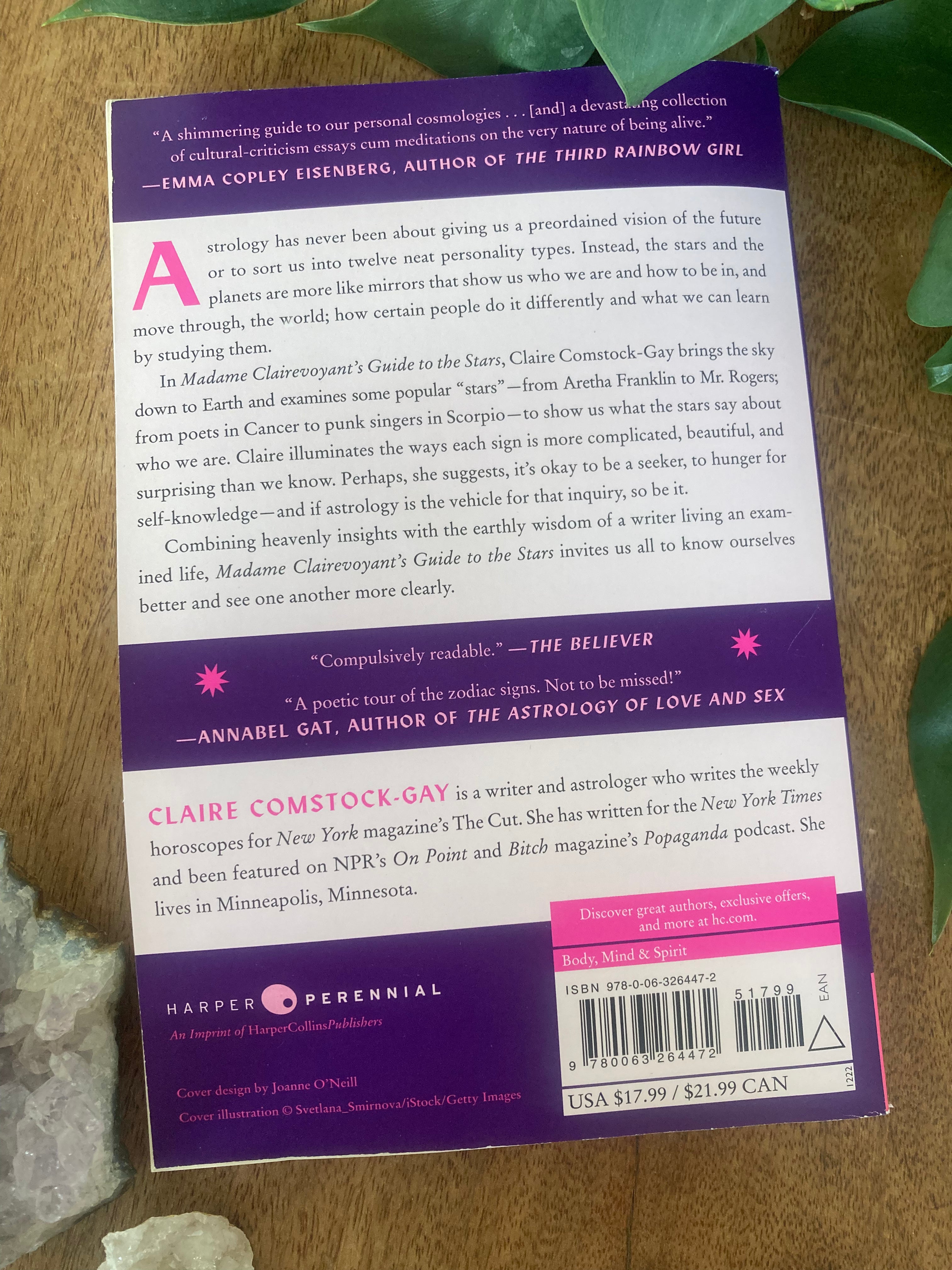 In Madame Clairevoyant’s Guide to the Stars, Claire Comstock-Gay brings the sky down to Earth and points to our popular “stars”—from Aretha Franklin to Mr. Rogers, from poets in Cancer to punk singers in Scorpio—to reveal what the sky has to teach us about being human. In this wise, lyrically written guide, she examines the twelve astrological signs, illuminating the ways each one is more complicated, beautiful, and surprising than you might have been told. Claire suggests that actually it’s okay, and even important, to be a seeker, to hunger for self-knowledge, and if astrology is the vehicle for that inquiry, so be it.