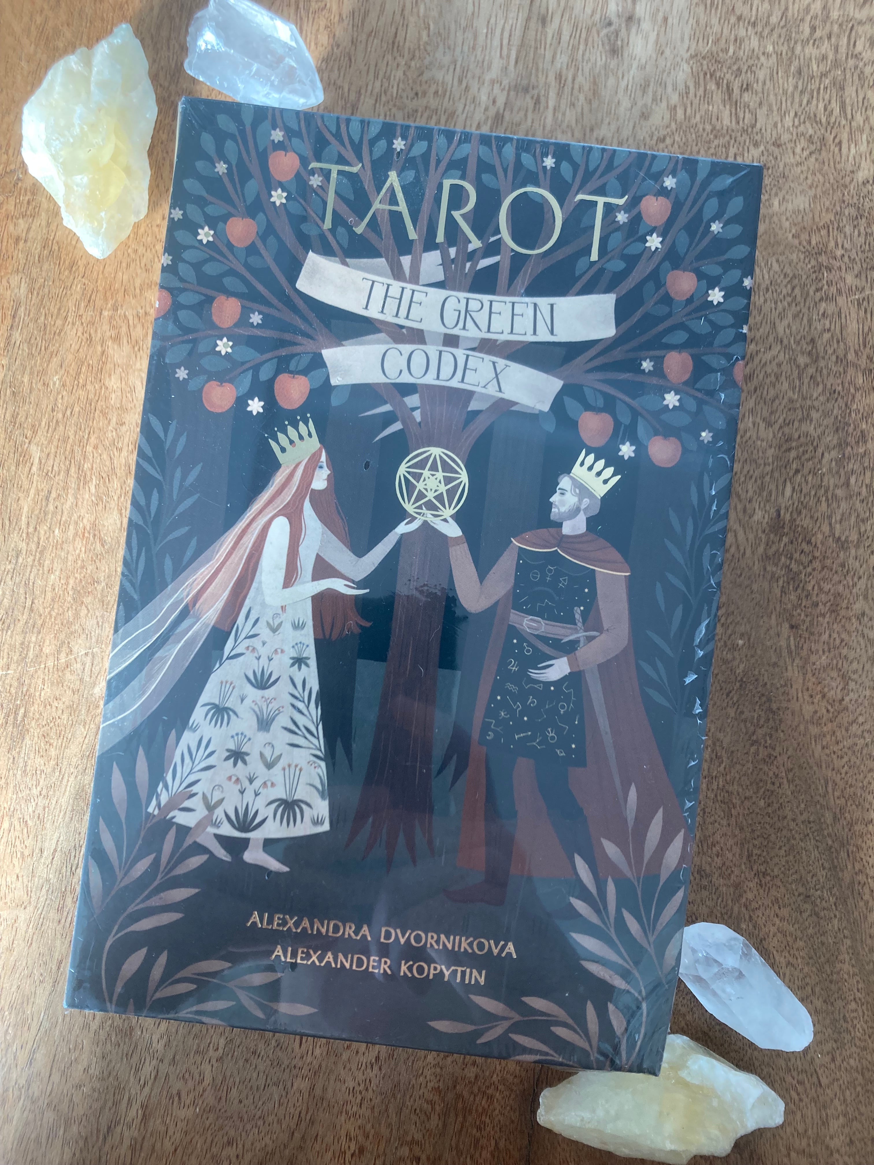 A starlit night sky, a silent pine grove, the sweet scent of resin carried by a quiet breeze―this is the enchanting atmosphere that permeates the cards of the Green Codex Tarot! This stunning kit showcases a deck of 78 cards, beautifully illustrated by artist Alexandra Dvornikova, along with a 192-page book by Alexander Kopytin that delves deep into topics of ecology and environment, unearthing the roots that unite humans and nature into a primordial network of life.